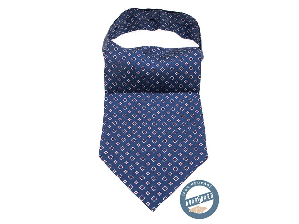 Modrý hedvábný askot se vzorem je výrobek české značky Avantgard.