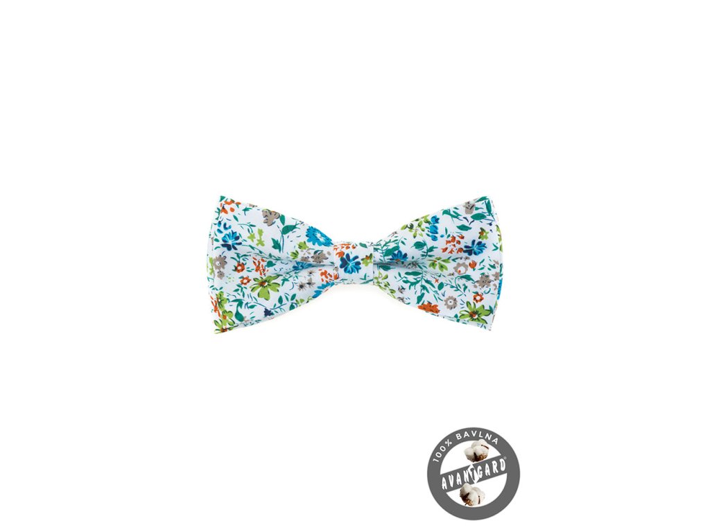 Bílý bavlněný pánský motýlek s tyrkysovými květy je předvázaný. Elegantní pánský doplněk nemusíte složitě vázat.