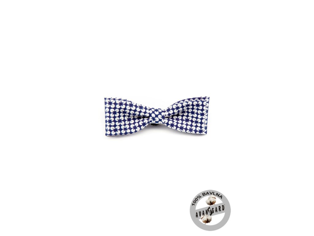 Tmavě modrý motýlek s květovaným vzorem je předvázaný. Elegantní pánský doplněk nemusíte složitě vázat.