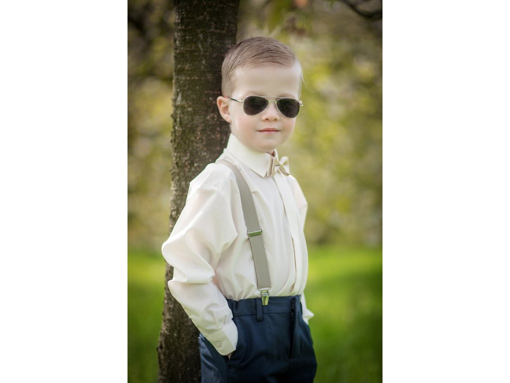 Smetanová chlapecká košile s krytou légou (pruh látky, který překrývá knoflíčky na přední straně košile) je vyrobena z materiálu, který obsahuje 40 % bavlny a 60 % polyesteru .
