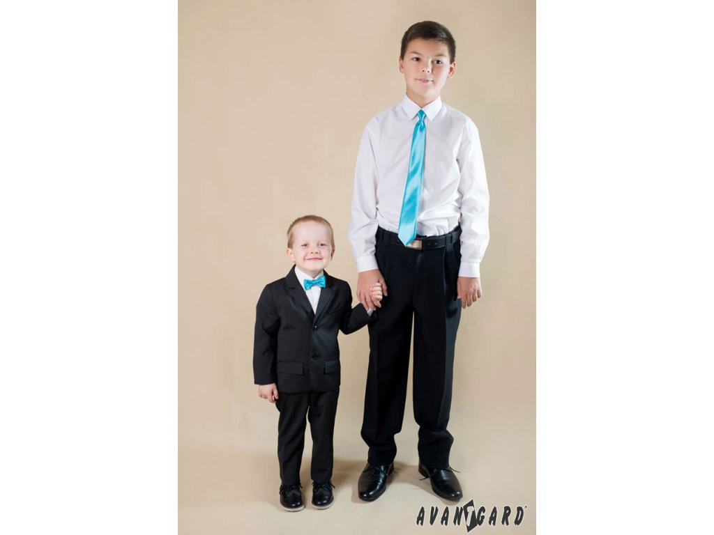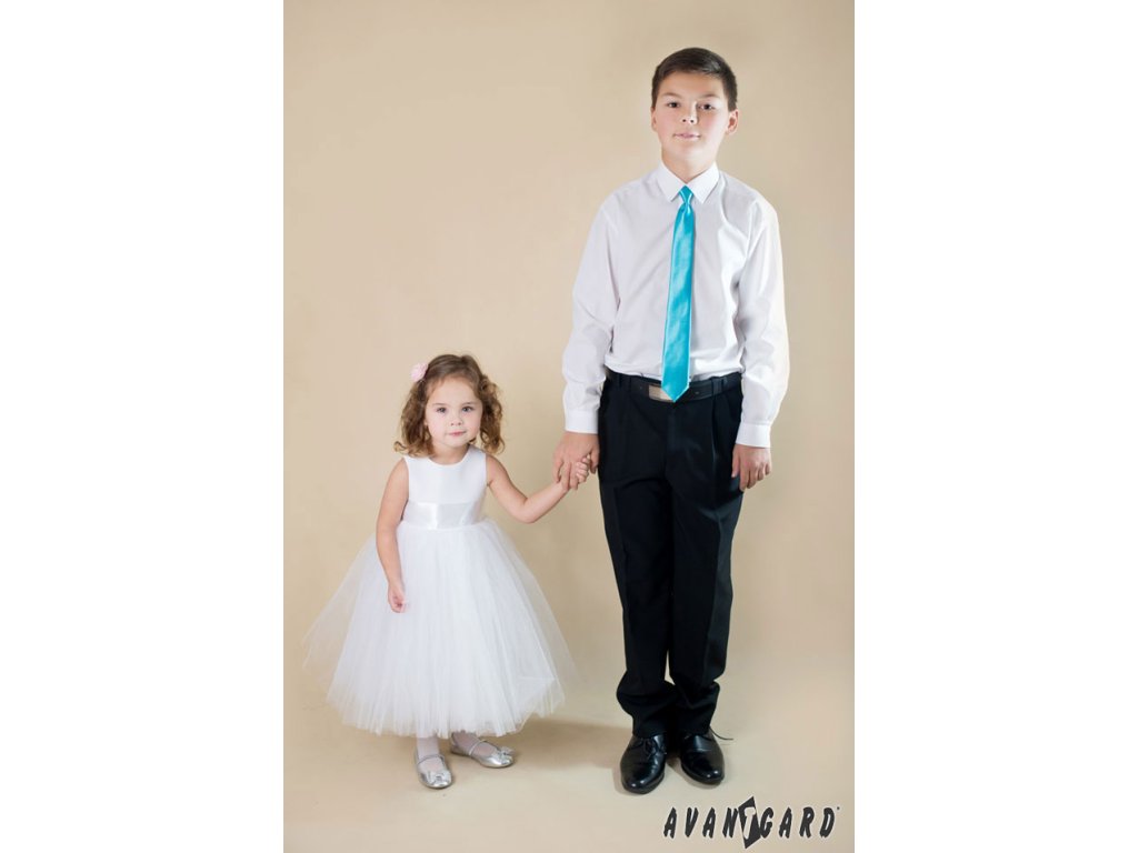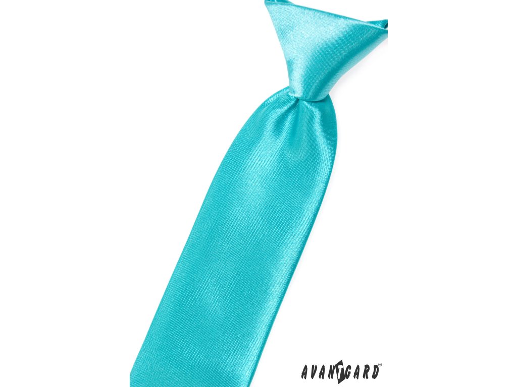 Tyrkysová jemně lesklá chlapecká kravata je vyrobena ze 100% polyesteru. Kravata je balena do průhledné ochranné folie.