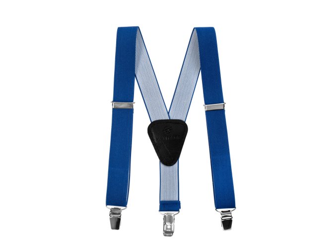 Královsky modré dětské kšandy s koženým středem mají uchycení na klipy.