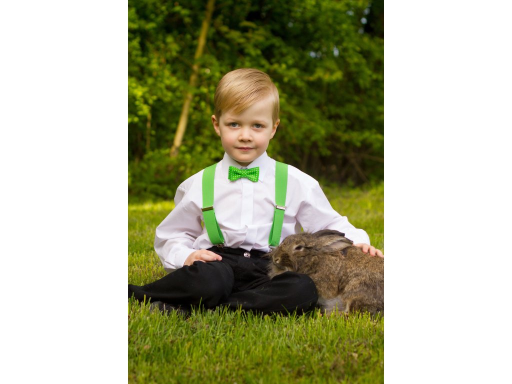 Neonově zelené dětské kšandy/šle s černým středem mají uchycení na klipy.