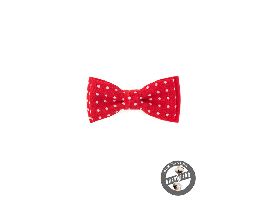 Červený dětský motýlek s puntíky je předvázaný. Elegantní pánský doplněk nemusíte složitě vázat.