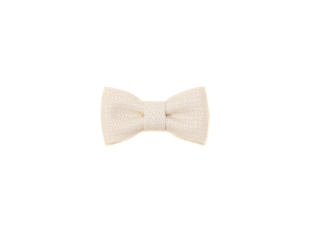 Smetanový dětský motýlek se vzorovanou strukturou je předvázaný – nemusíte jej složitě vázat a uchytíte jej ke krku pomocí pásku, jehož délku je možné regulovat.