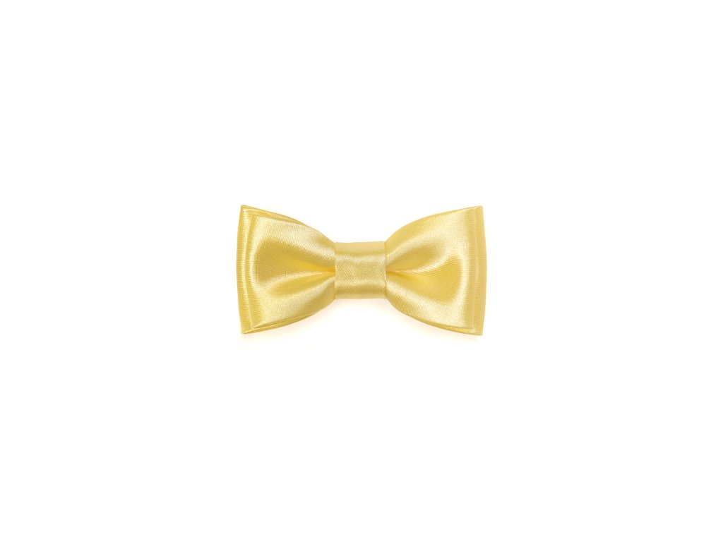 Žlutý dětský lesklý motýlek je předvázaný. Elegantní doplněk nemusíte složitě vázat.