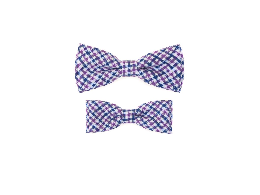 Světle fialová károvaná sada bavlněného dětského a pánského motýlku
