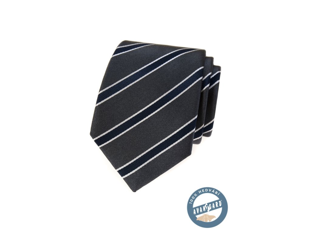 Šedá hedvábná kravata s tmavými pruhy + krabička