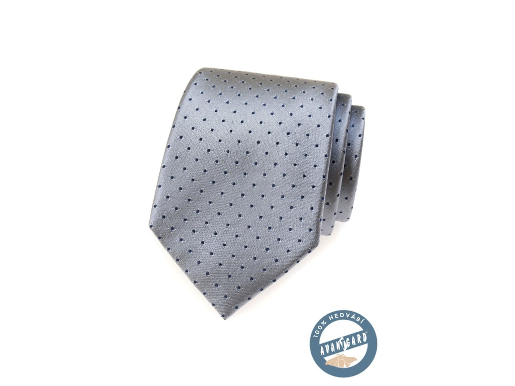 Světle šedá kravata s tmavými tečkami je 7 cm široká a je vyrobena ze 100% hedvábí.