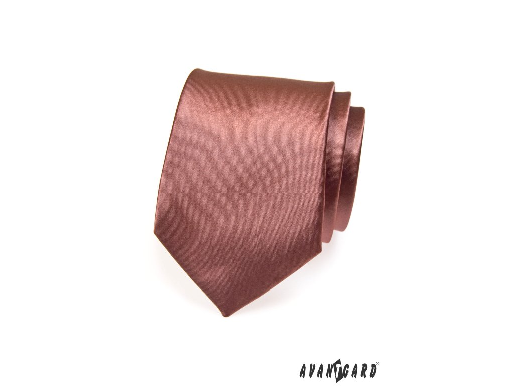 Hnědá jednobarevná lesklá kravata se liší od jiných kravat svým leskem a jednobarevným povrchem. Na kravatě není žádný vzor, naopak oslňuje pouze svou zářivou barvou, která na sebe vždy upoutá pozornost. Kravata je vyrobena ze 100% polyesteru.