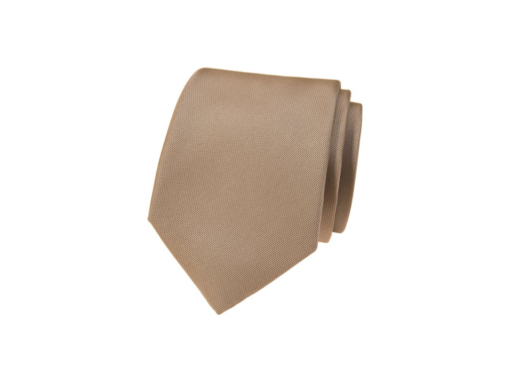 Sytě béžová luxusní pánská kravata se vzorovanou strukturou je 7,5 cm široká a je vyrobena ze 100% polyesteru.