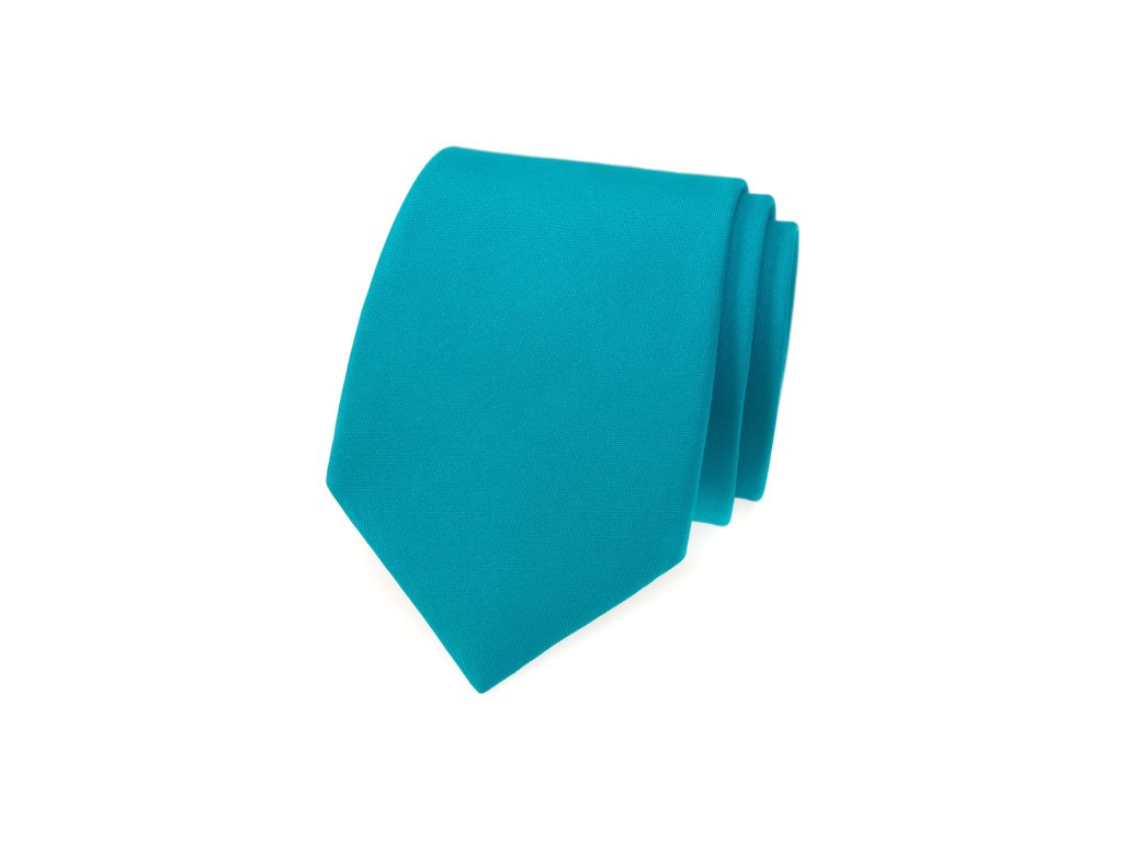 Sytě tyrkysová matná kravata je vyrobena ze 100% polyesteru.