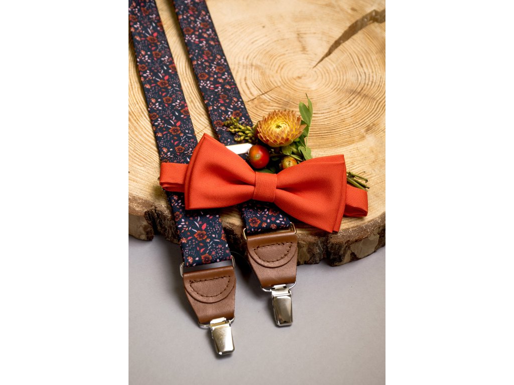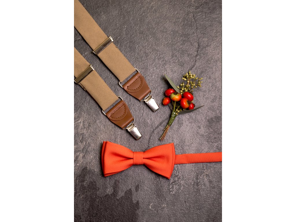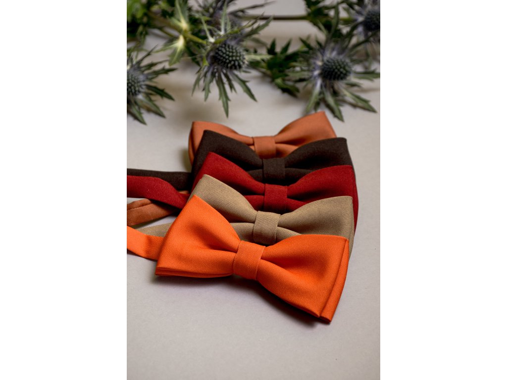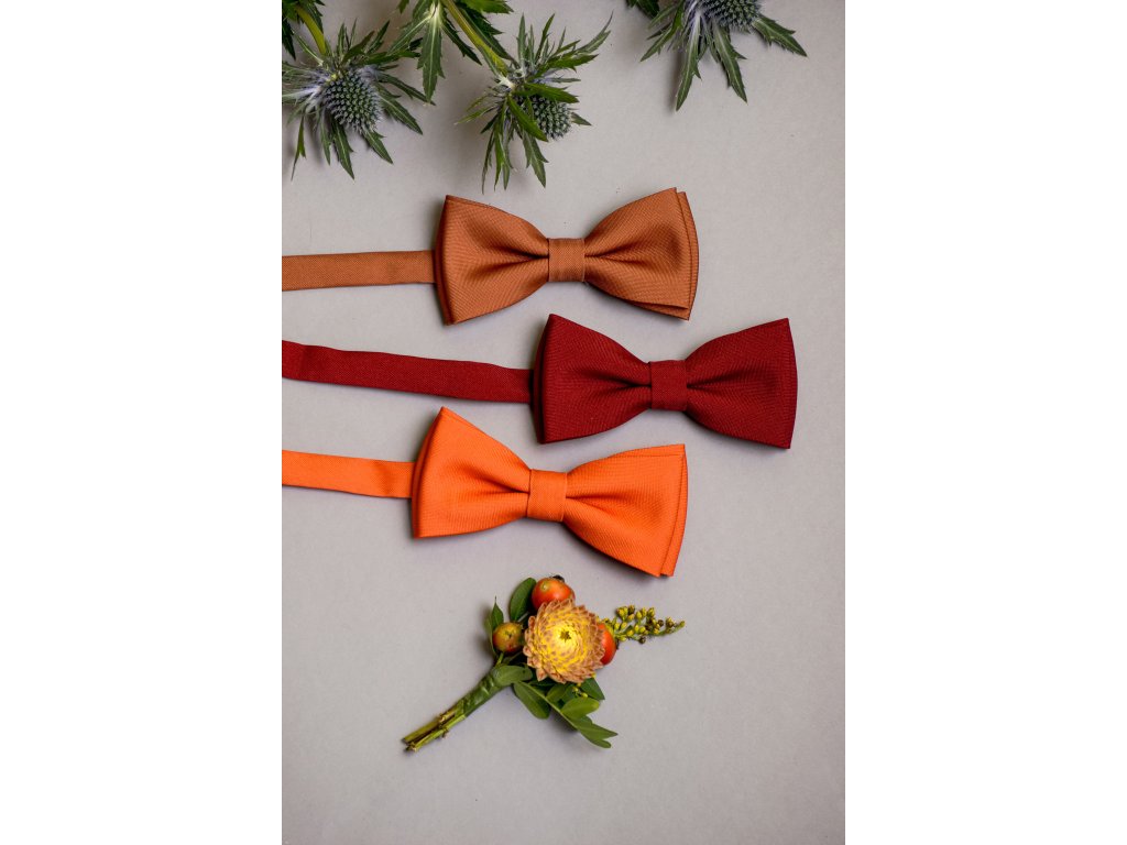 Oranžový pánský motýlek je předvázaný. Elegantní pánský doplněk nemusíte složitě vázat.