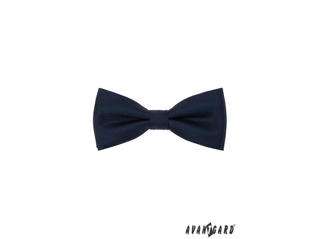 Tmavě modrý pánský motýlek s vroubkovanou strukturou je předvázaný a ke krku jej uchytíte pomocí pásku, jehož délku je možné regulovat.