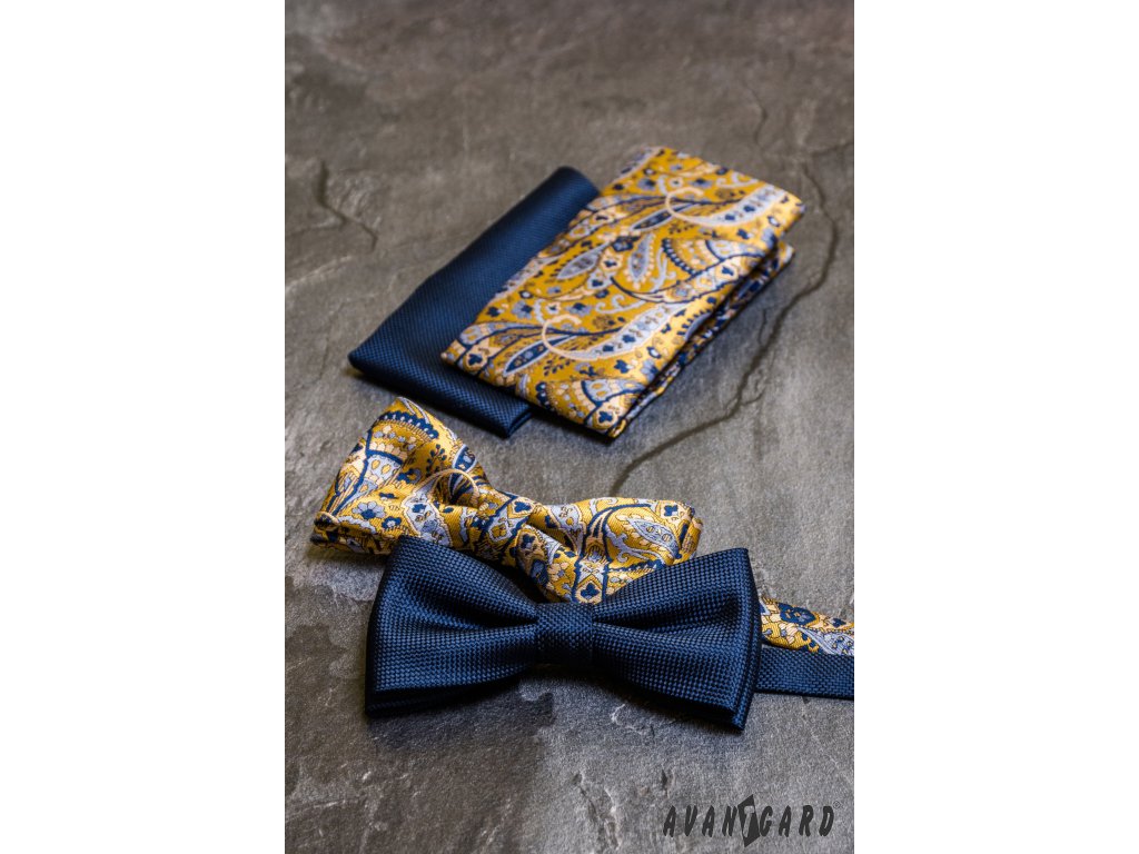 Tmavě modrý pánský motýlek s vroubkovanou strukturou + kapesníček do saka