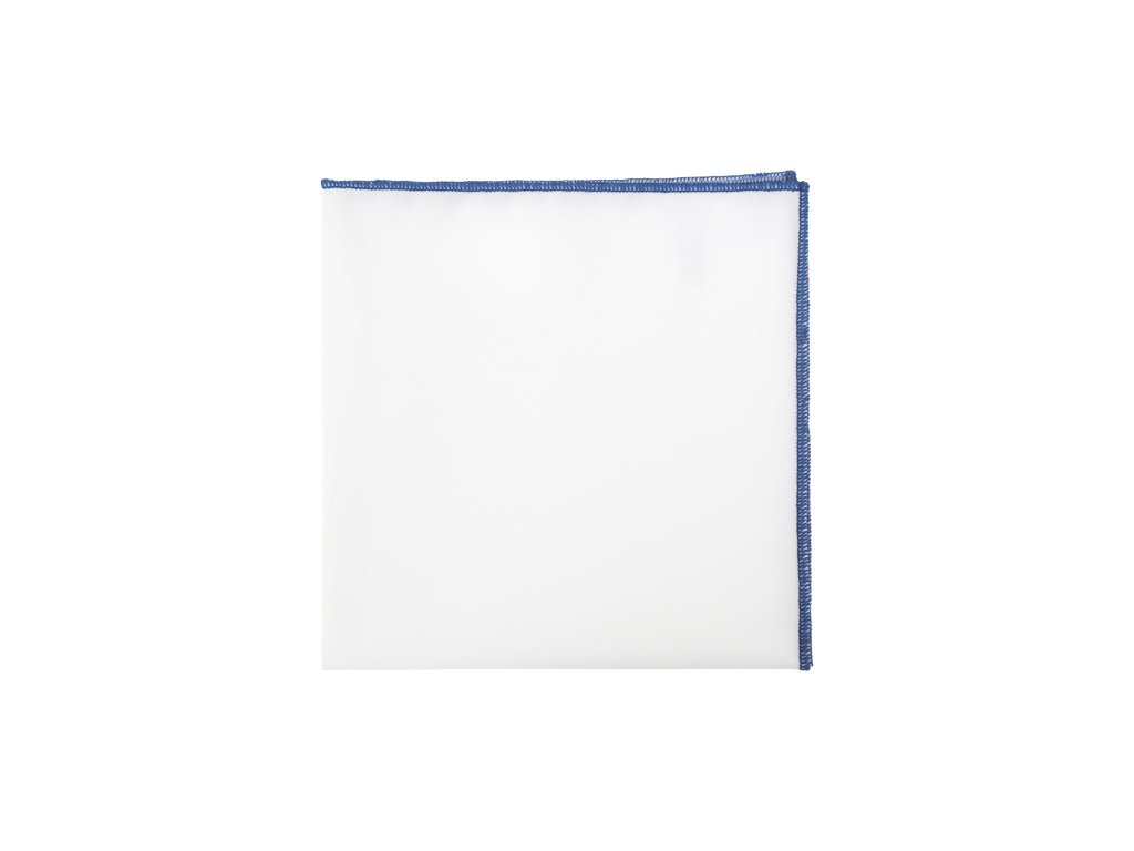 Bílý bavlněný luxusní kapesníček do saka s modrým okrajem je vyroben ze 100% bavlny a jeho rozměry jsou 28x28 cm.