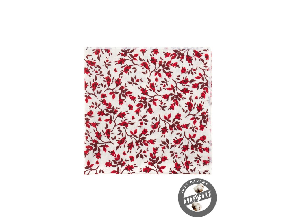 Bílý luxusní kapesníček do saka s červenými květy je vyroben ze 100% bavlny popelín.