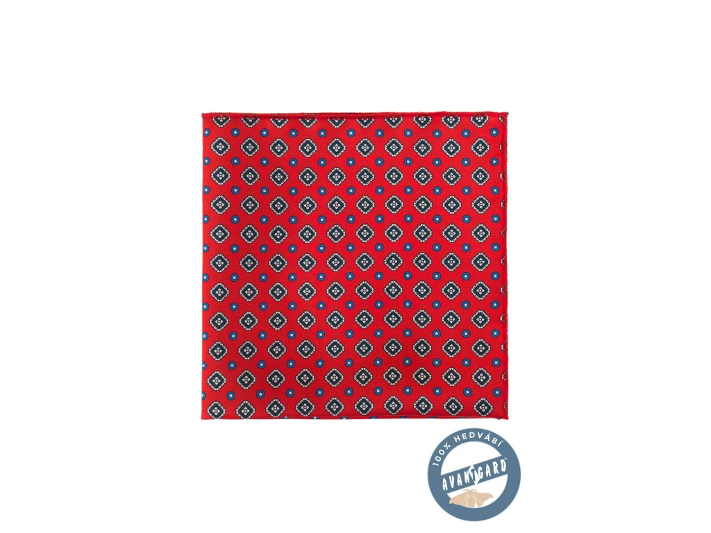 Červený kapesníček se vzorem a modrým okrajem je vyroben ze 100% hedvábí.
