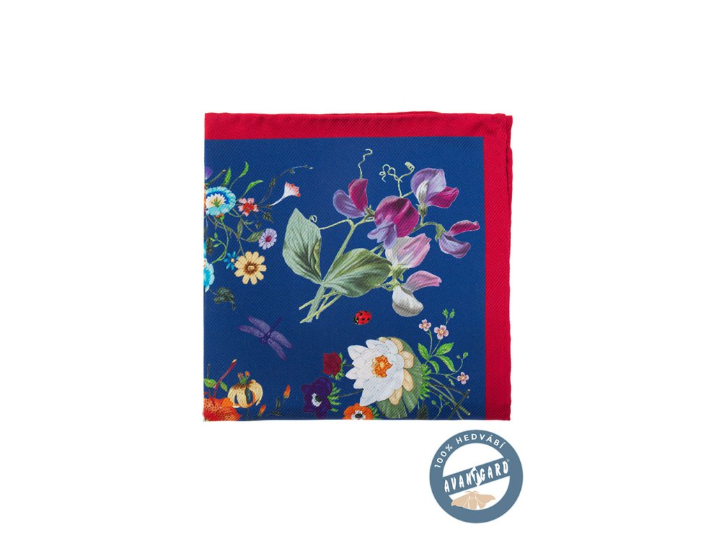 Modrý hedvábný kapesníček s květy a červeným okrajem je výrobek české značky Avantgard.