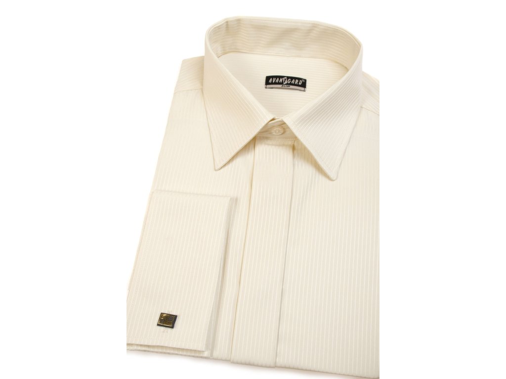 Pánská smetanová košile s jemnými pruhy střihu SLIM FIT je na manžetové knoflíčky, má dlouhý rukáv, klasický límec a francouzské manžety. Jedná se o český výrobek značky Avantgard.