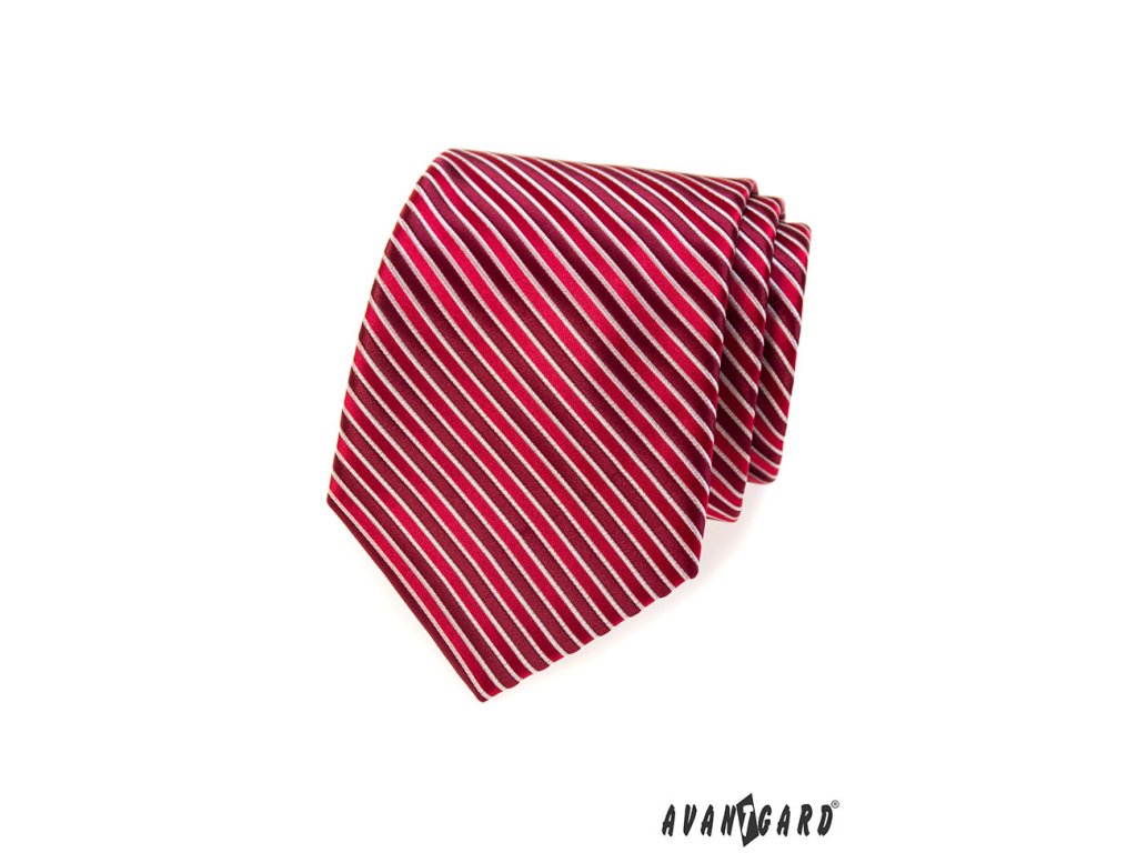 Červená kravata s tenkými bílými proužky je výrobek české značky Avantgard.