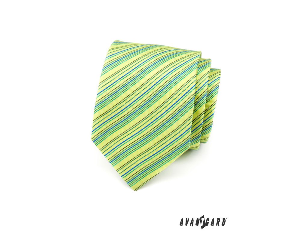 Proužkovaná světle zelená kravata je zajímavá svým velice nenápadně rýhovaným povrchem. Kravatu zdobí tenké proužky zelené, černé a modré barvy. Díky barevnosti působí kravata velmi vesele. Proužky jsou šity tak, že na kravatě opticky vytvářejí něžné drobné korálky. Kravata je vyrobena ze 100% polyesteru.