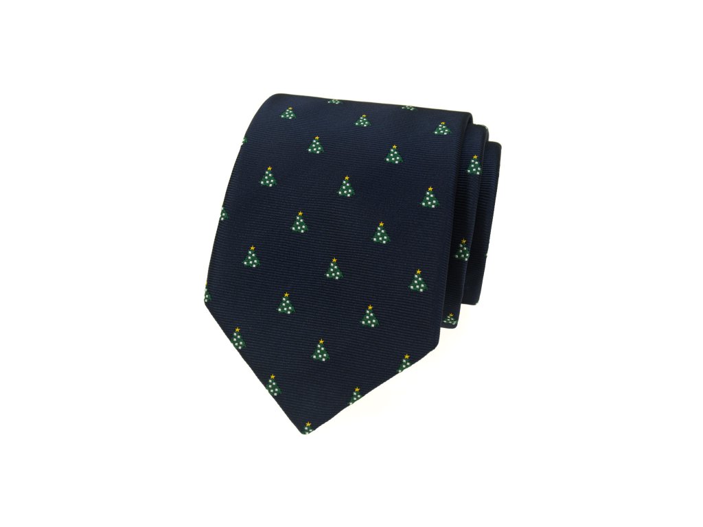 Modrá luxusní pánská kravata se stromečky + kapesníček do saka (vánoční dárková sada)