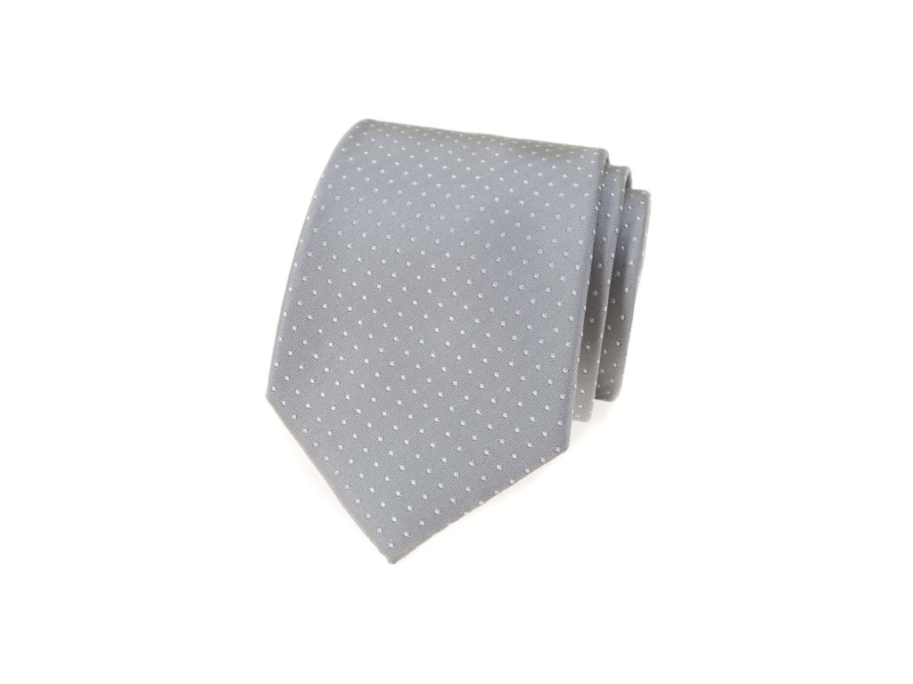 Světle šedá luxusní pánská kravata s bílými tečkami je 7 cm široká a je vyrobena ze 100% polyesteru.