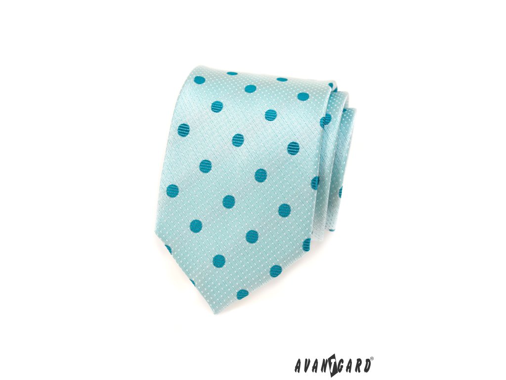 Světle tyrkysová kravata s většími puntíky je výrobek české značky Avantgard.