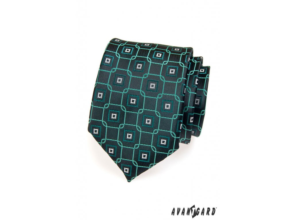 Tmavě zelená kravata s kostkovaným vzorem je nepřehlédnutelným pánským doplňkem. Na kravatě je možné najít kombinaci tyrkysové, modré a bílé barvy, která nepatrně působí neonovým dojmem. Kravata je vyrobena ze 100% polyesteru.