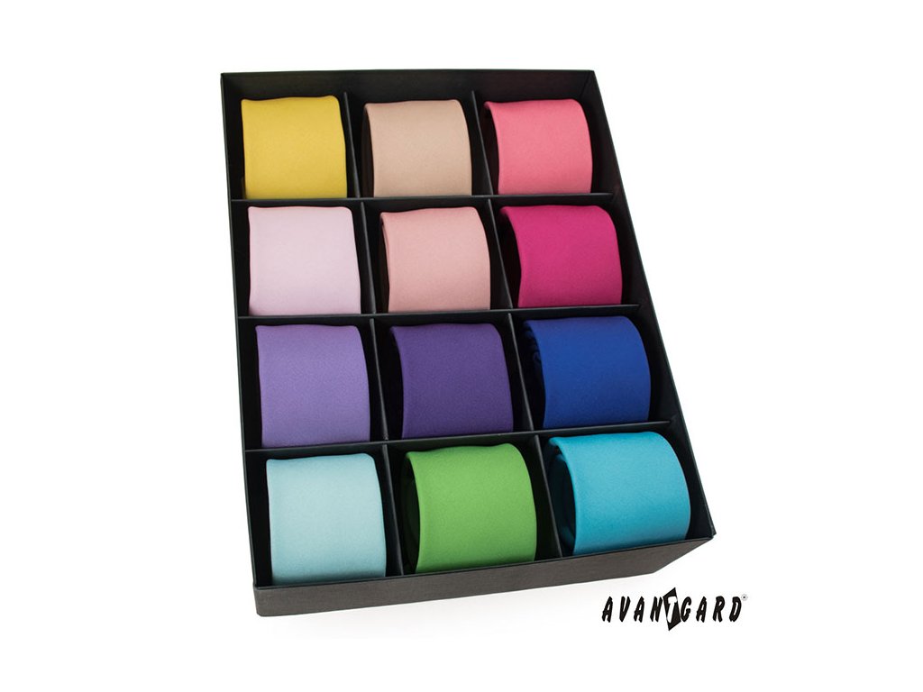Sada 12 barevných luxusních kravat české značky Avantgard obsahuje klasické kravaty vyrobené ze 100% polyesteru o šířce 7 cm.