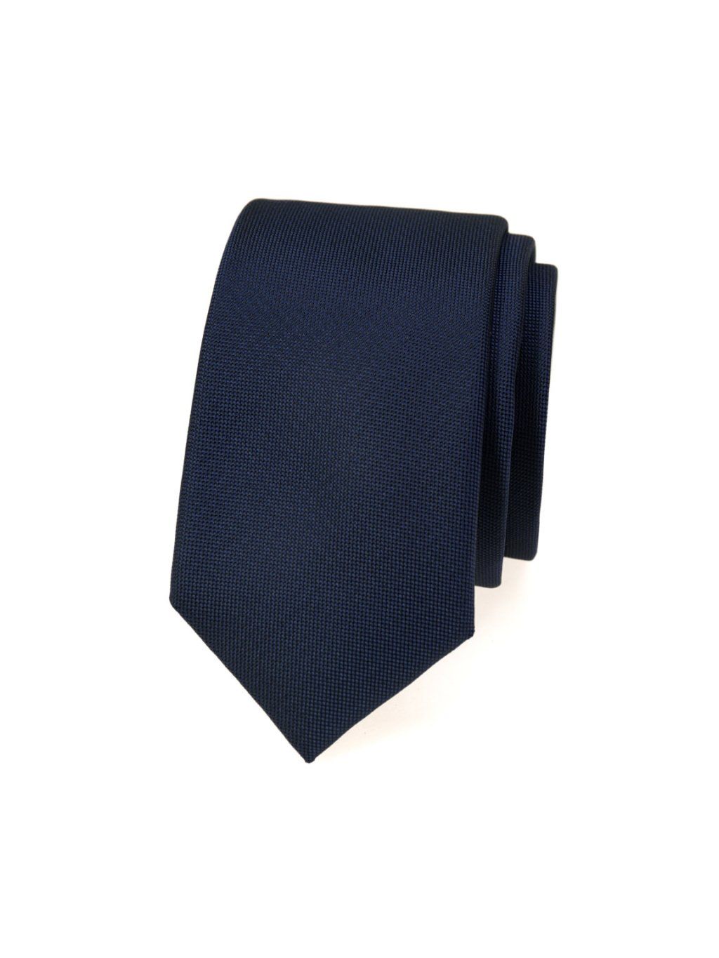 Tmavě modrá slim kravata je výrobek české firmy Avantgard. Kravata je balena do průhledné ochranné folie.