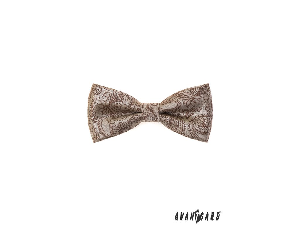 Béžový pánský motýlek s hnědým vzorem je předvázaný. Elegantní pánský doplněk nemusíte složitě vázat.