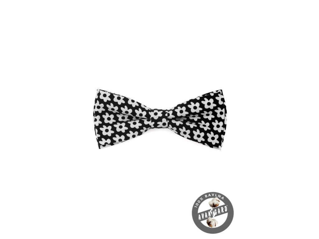 Černý bavlněný pánský motýlek s bílými květy je předvázaný. Elegantní pánský doplněk nemusíte složitě vázat.