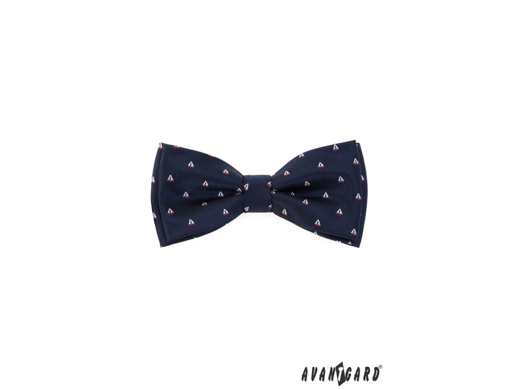 Modrý pánský motýlek se vzorem plachetnice je předvázaný. Elegantní pánský doplněk nemusíte složitě vázat.