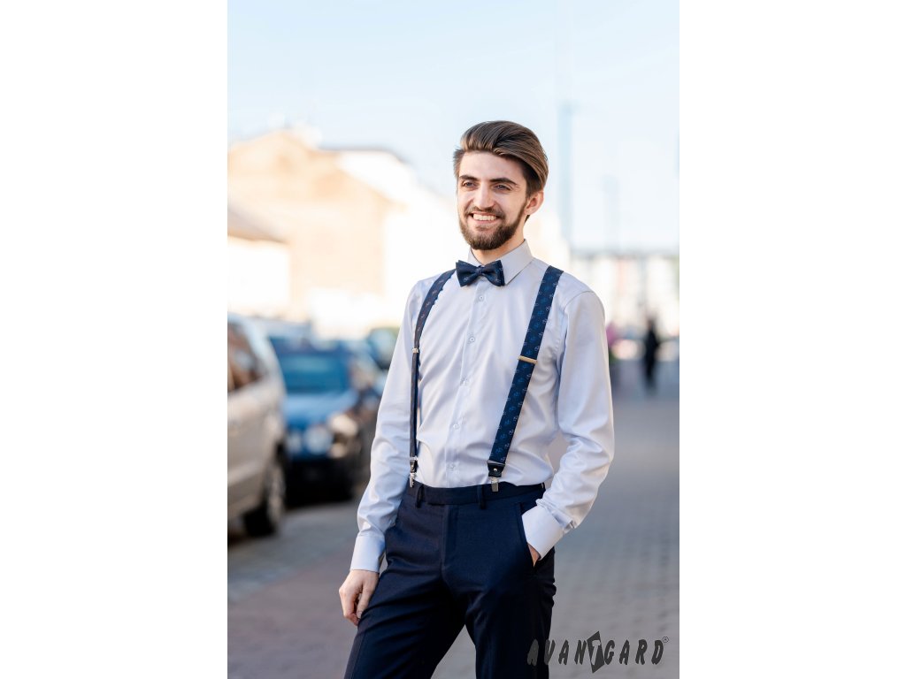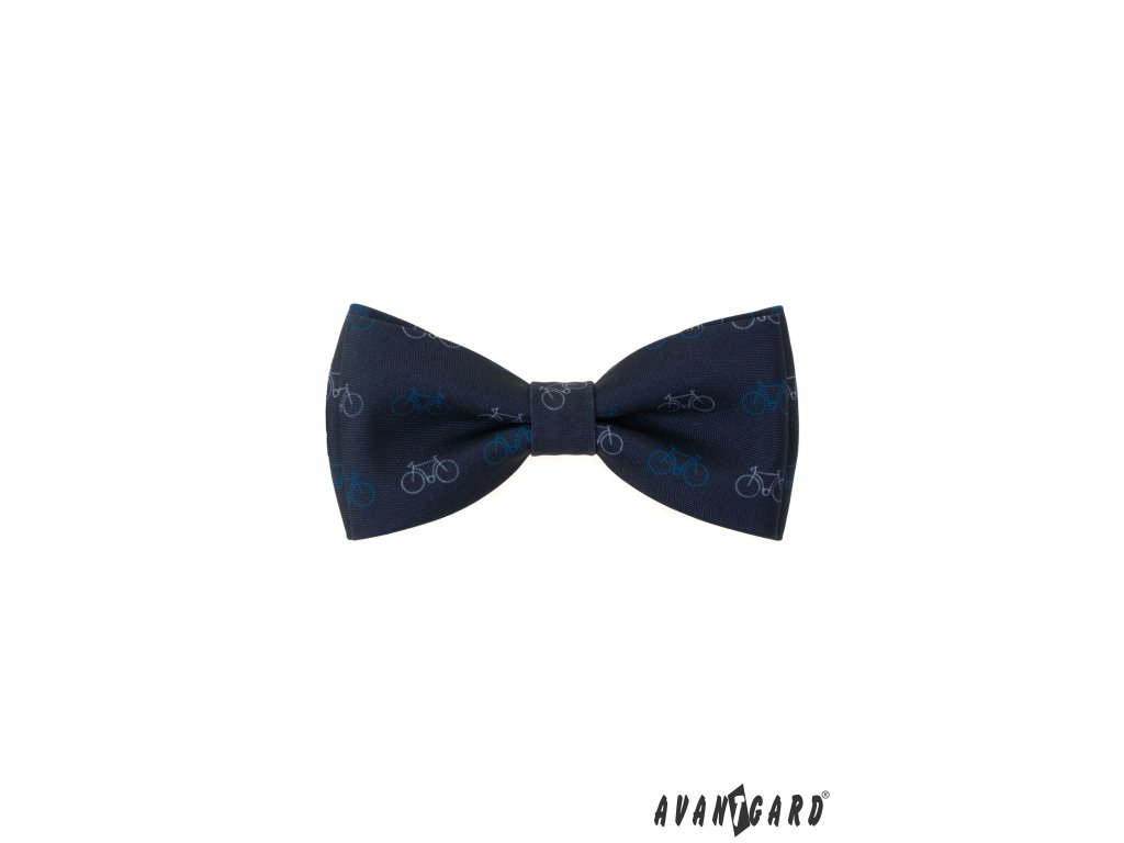 Tmavě modrý pánský motýlek se vzorem – Kola je předvázaný a ke krku jej uchytíte pomocí pásku, jehož délku je možné regulovat.