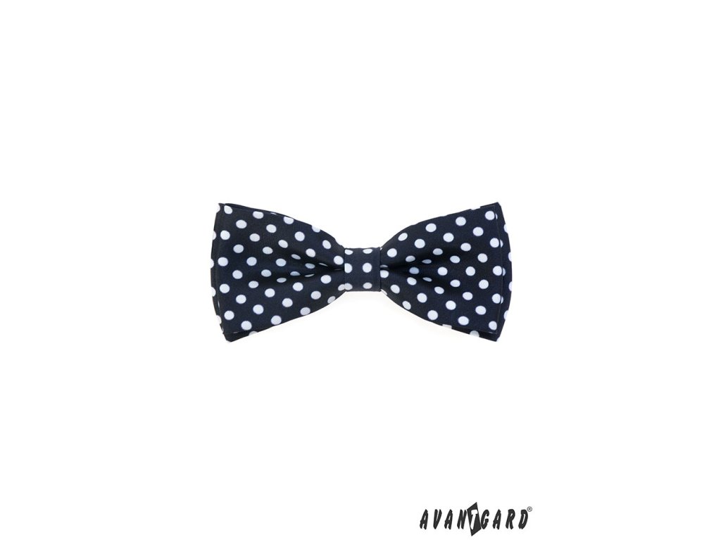 Velmi tmavě modrý motýlek s puntíky je předvázaný. Elegantní pánský doplněk nemusíte složitě vázat.