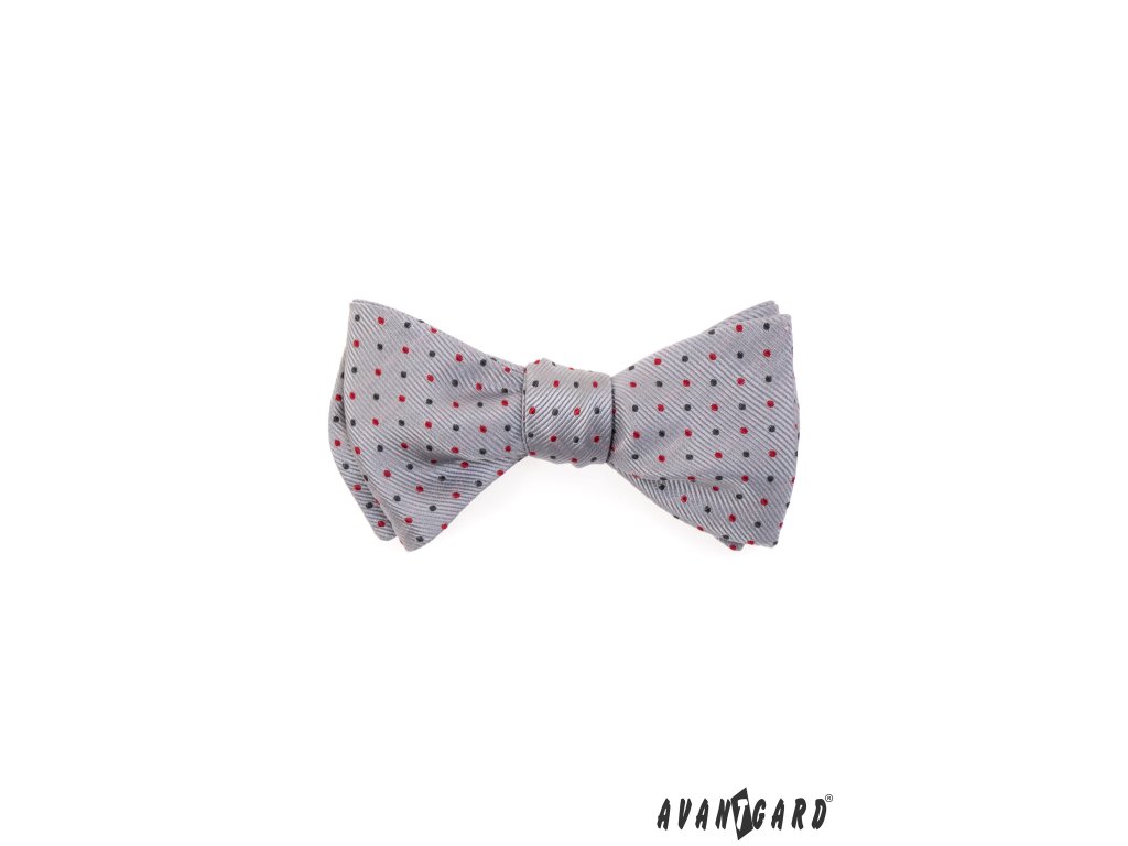 Světle šedý vázací motýlek s červenými puntíky má, po uvázání, velikost cca 12 cm.