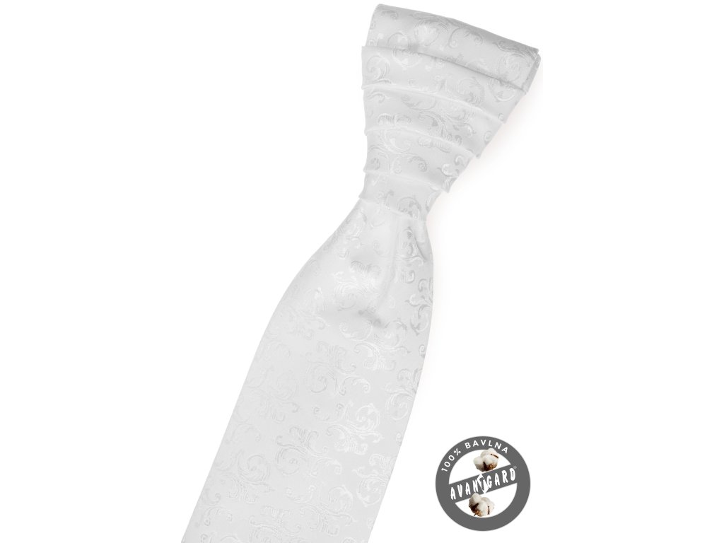 Bílá pánská regata se vzorem stejné barvy je druh pánské kravaty, která má předvázaný ozdobný uzel.