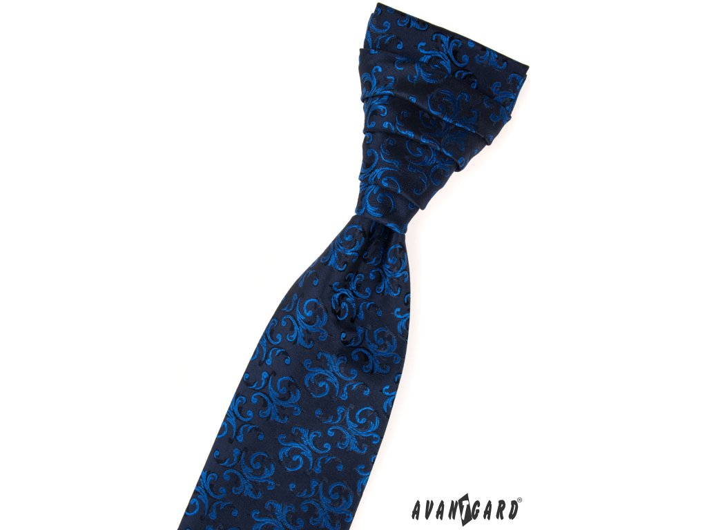 Tmavě modrá pánská regata se zářivě modrým vzorem je druh pánské kravaty, která má předvázaný ozdobný uzel.