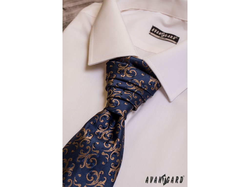 Velmi tmavě modrá pánská regata se zlatým vzorem je druh pánské kravaty, která má předvázaný ozdobný uzel.