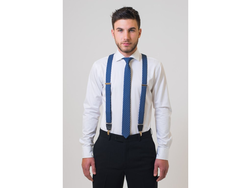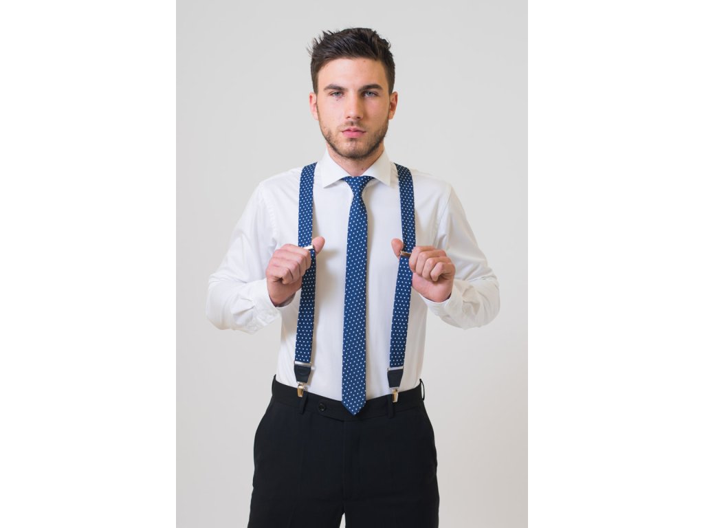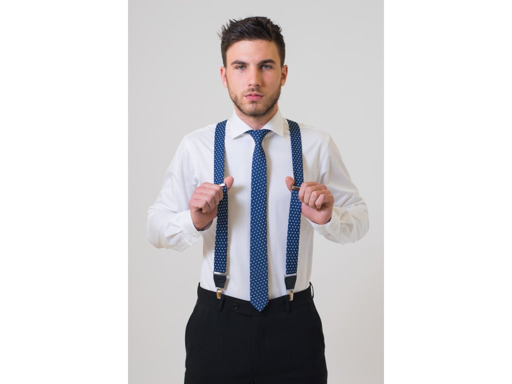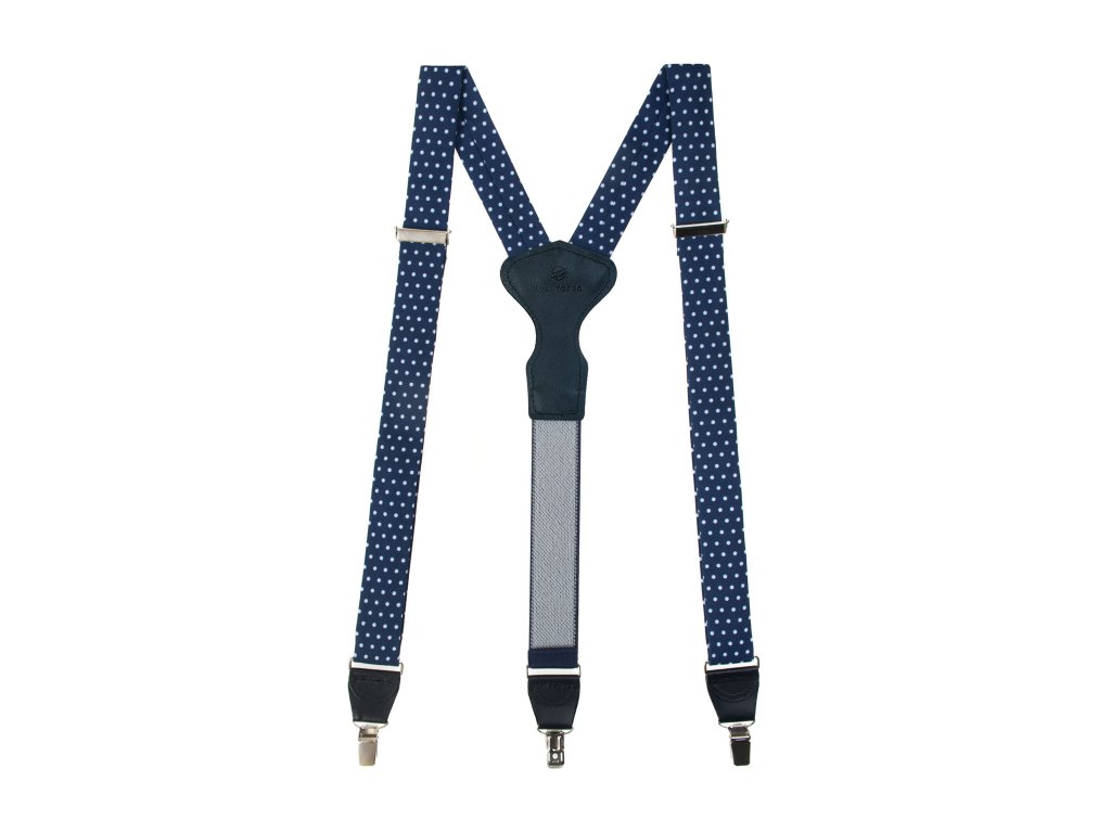 Modré látkové šle s bílými puntíky a černým středem mají uchycení na klipy.
