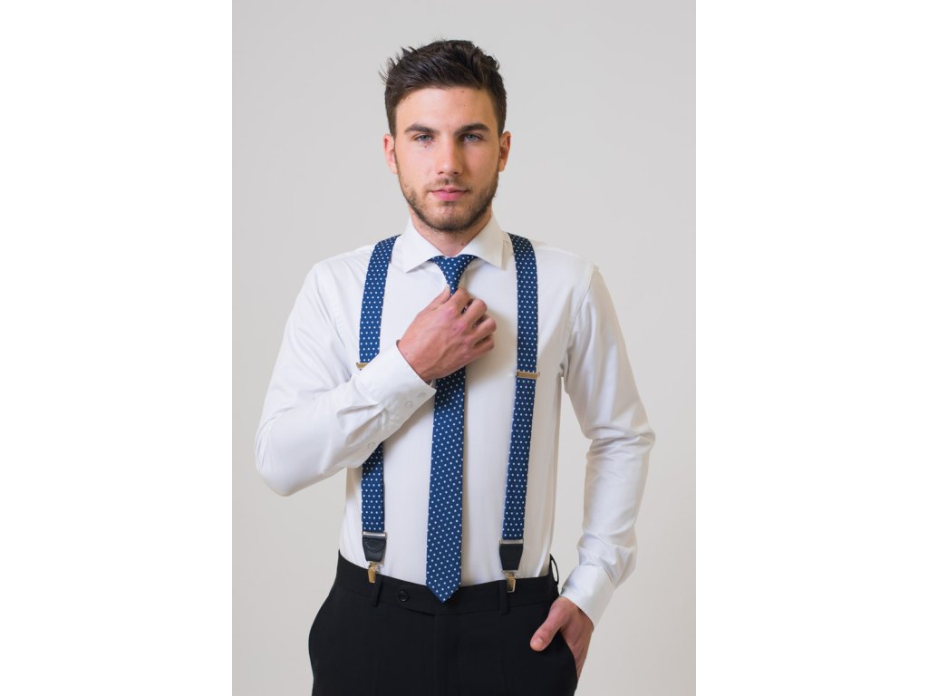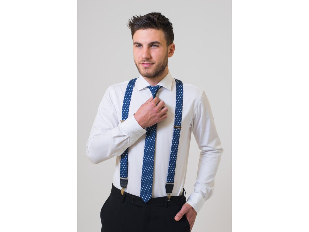Modré látkové šle s bílými puntíky a černým středem + krabička