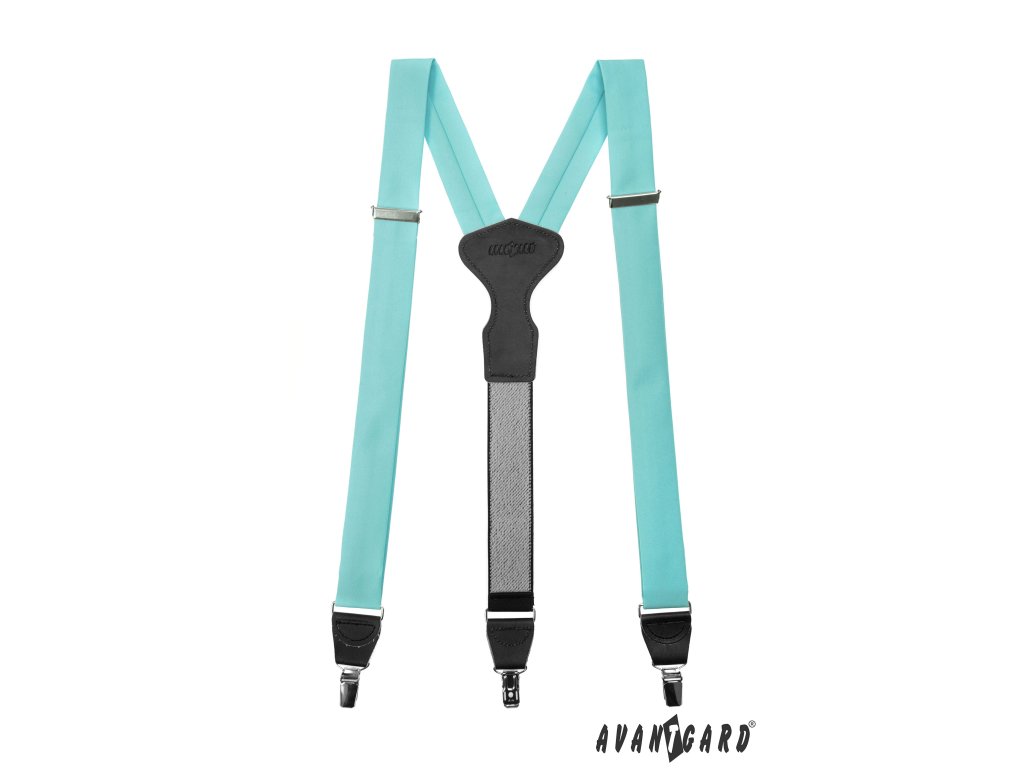 Světle mátové látkové šle s černým středem mají uchycení na klipy.