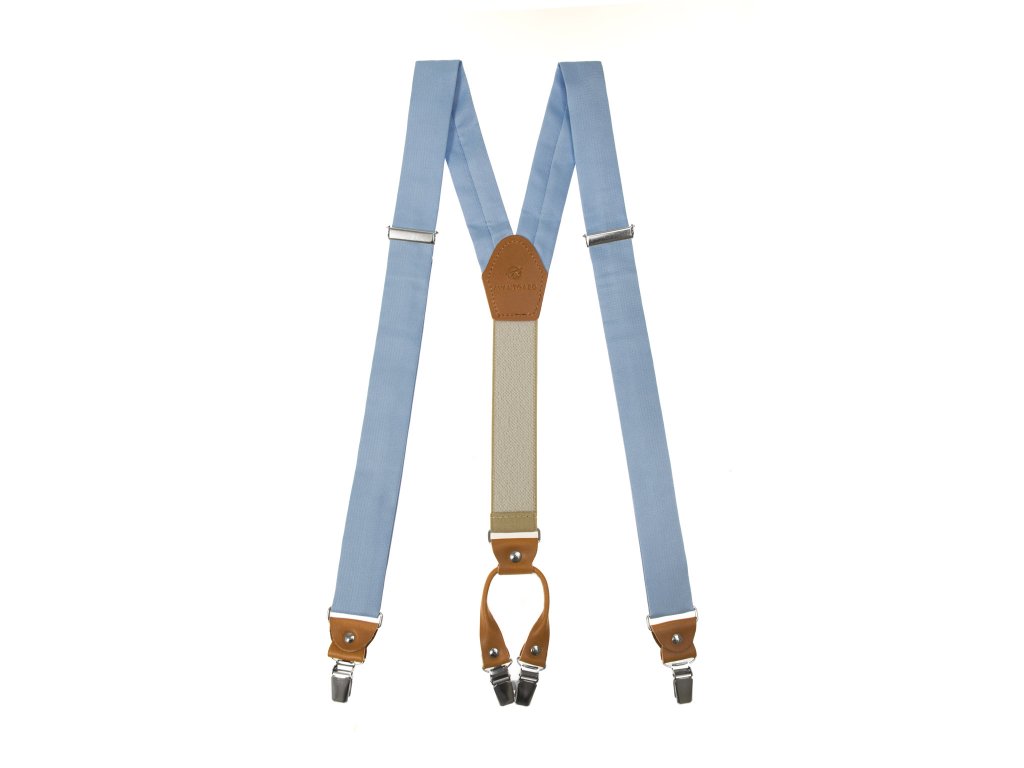 Světle modré široké látkové pánské kšandy s koňakově hnědým středem jsou široké 3,5 cm, mají kovové klipy na zapínání a celokožený střed.