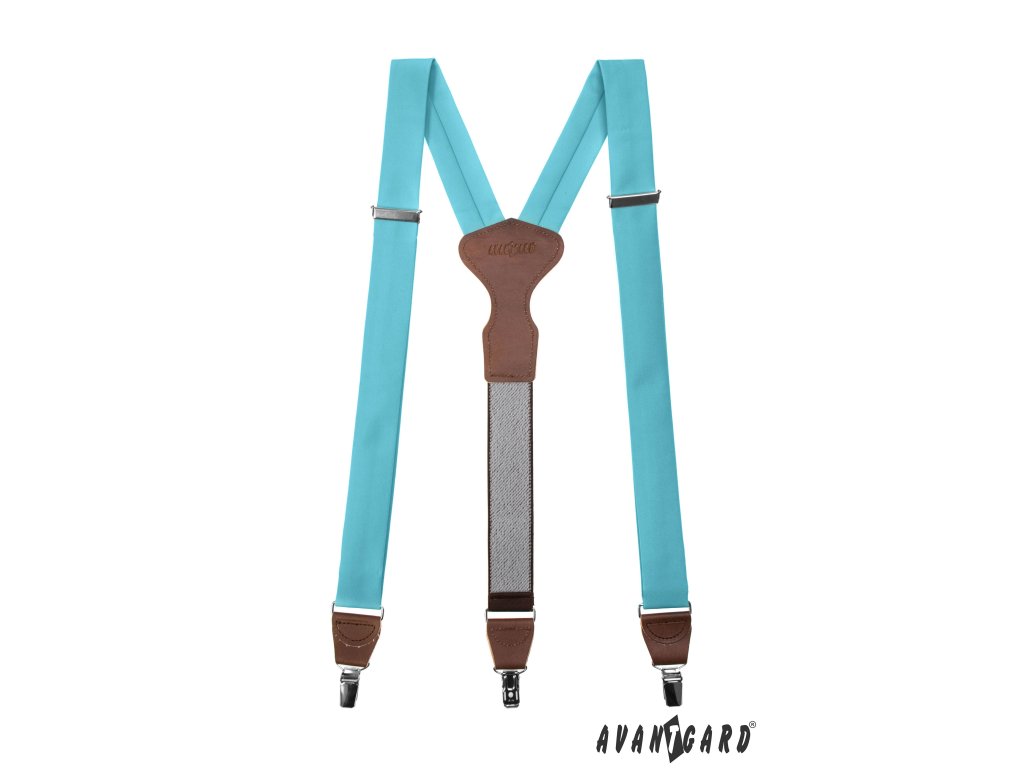 Tyrkysové látkové šle s tmavě hnědým středem mají uchycení na klipy.