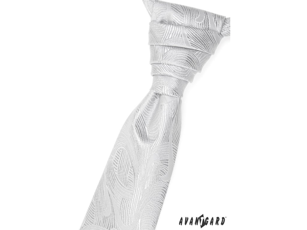 Stříbrná pánská regata s nenápadným vzorem je druh pánské kravaty, která má předvázaný ozdobný uzel.