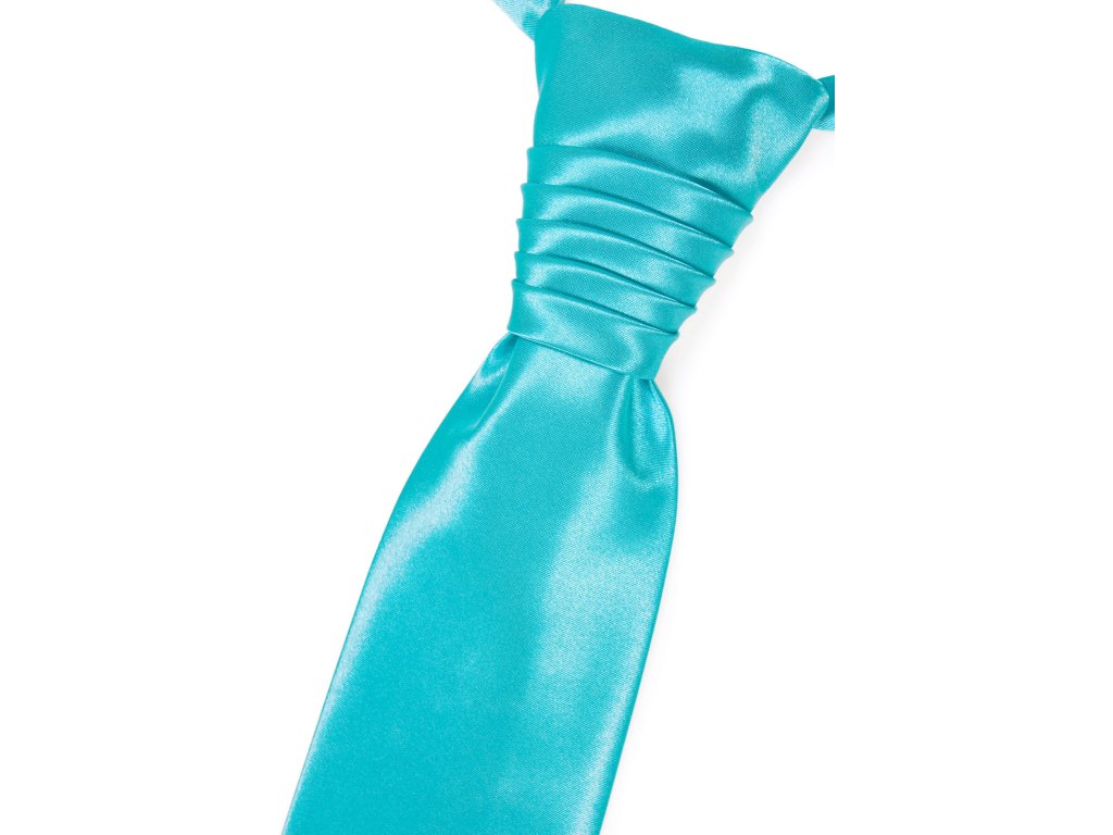 Zářivě tyrkysová jednobarevná pánská regata je druh pánské kravaty, která má předvázaný ozdobný uzel.