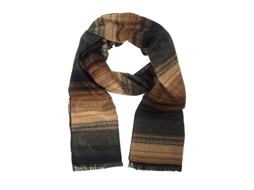 Hnědá pánská šála s šedým vzorem je vyrobena ze 100% viskózy.
