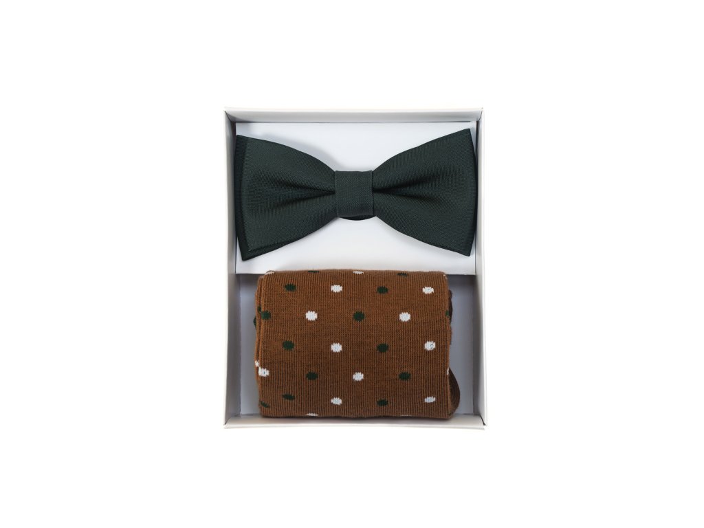 Tmavě zelená dárková sada obsahuje pánský motýlek (12,5 cm) a pánské ponožky.